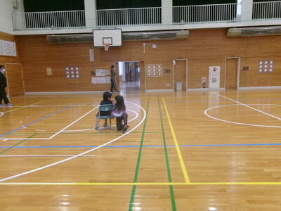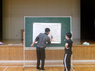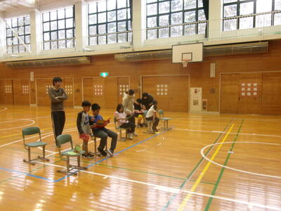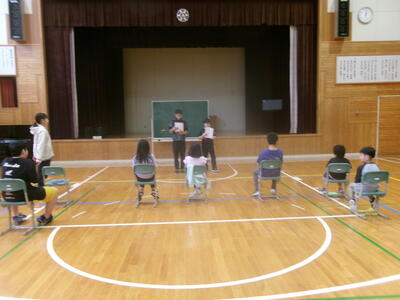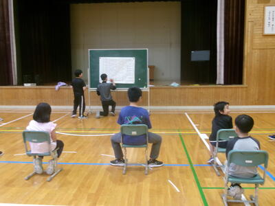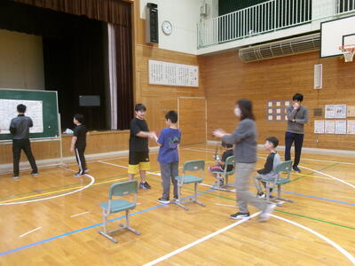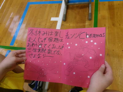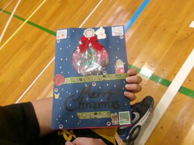 オープニングは「いすとりゲーム」。みんなで音楽にのりながらワイワイはしゃぎましたが、「その順位が高かった順番に、クリスマスカード交換のあみだくじを選ぶことができる」という特典つき!これがまた盛り上がる要素となりました。このようなアイデアや企画をしっかり準備し、みんなに堂々と提示できる児童会三役の力も見事でした!