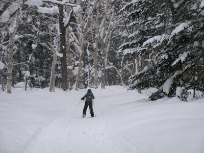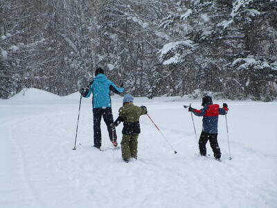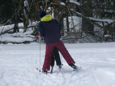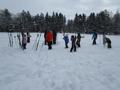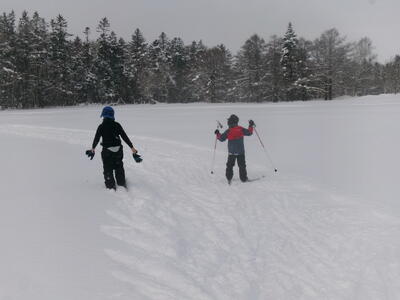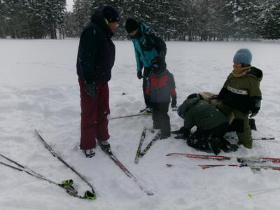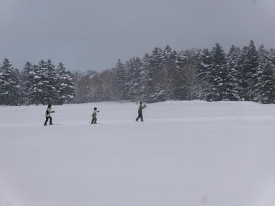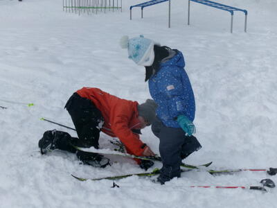 初回の今日は、たてわり班ごとに、上学年が下学年に、板とくつの付け方、歩き方や進み方を教えるところから始めました。1年生にとっては、小学校生活そのものが「未知への挑戦」とも言えた1.2学期でしたが、3学期にもまた1つ、挑戦心をかき立てられるものに出会った心境だったと思います。ゲレンデスキーとは全然違う感覚、操作の難しさ・・・大いに困りながら、何度も転びながら、それでも初回のクロスカントリーの時間を笑顔で終えることができました。